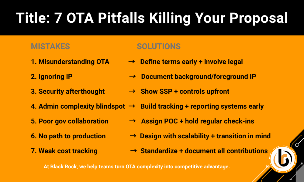 Before submitting your next OTA proposal, download Black Rock’s Tech Modernization Checklist. It will help you verify that your systems, data protections, and readiness plans meet the expectations of modern defense sponsors.
