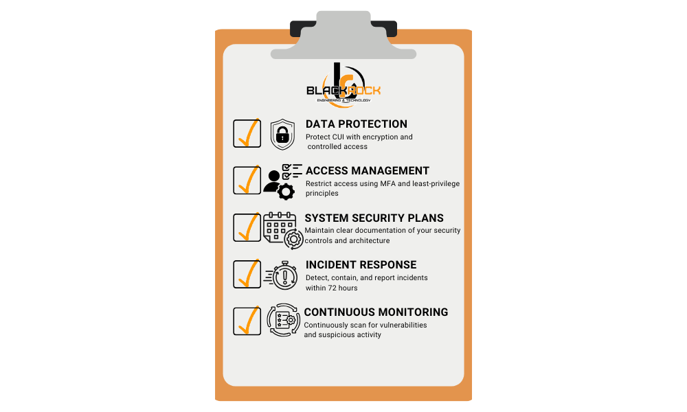 1. Data Protection: Encrypt data in transit and at rest. Identify which information qualifies as CUI and apply appropriate access control and monitoring.